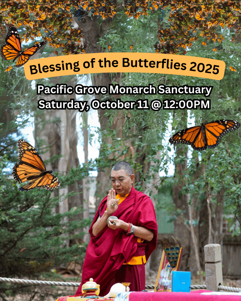 Every year, Khenpo Karten Rinpoche prays together with the Pacific Grove community for the monarch butterflies as they make their epic 3000 mile migration, stopping at the Pacific Grove Monarch Sanctuary. The monarchs need prayers more than ever.