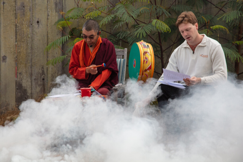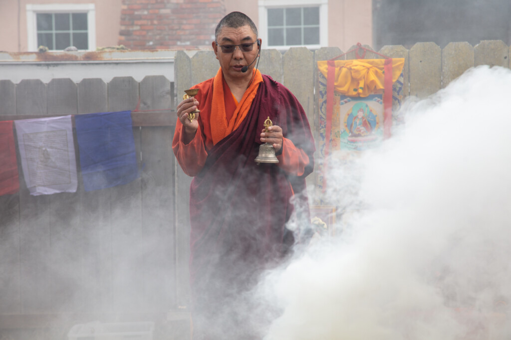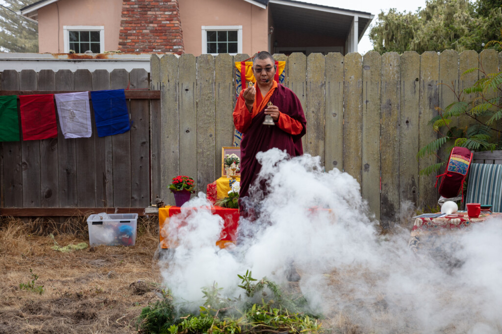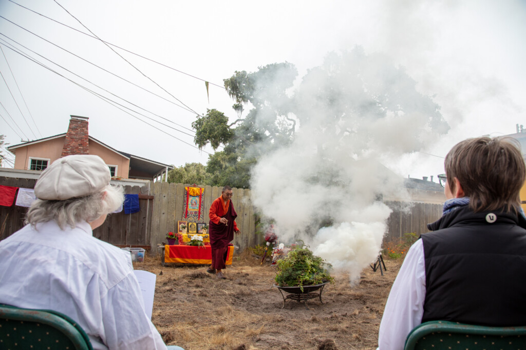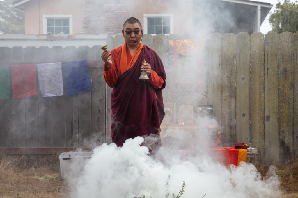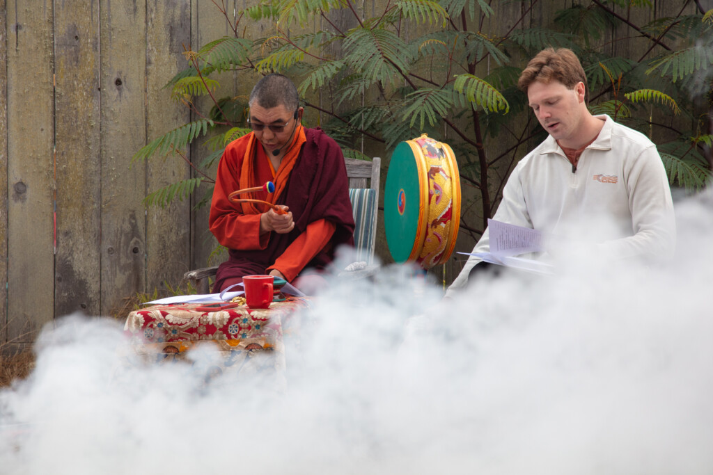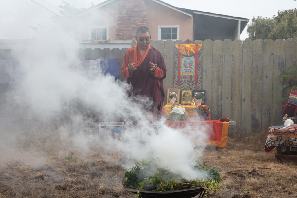 On Thursday, July 10, 2025 from 10:00am to 11:00am, Khenpo Karten Rinpoche conducted a ceremony for the occasion of Dzam Ling Chi Sang, known also as Universal Prayer day. The ceremony is for purification on the full moon day of the 5th Tibetan month, and involves special herbs and consecrated fire (more background is below). The smoke from this year’s fire was especially beautiful, and the feeling of blessing was palpable. Here are photos from the day taken by Miles McBreen/Karma Palden.