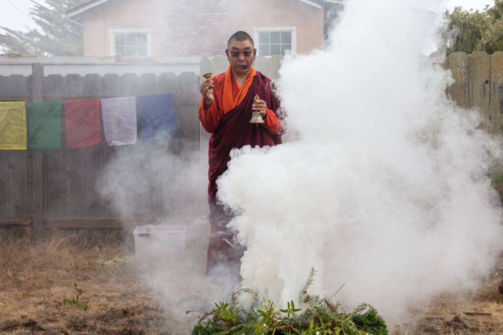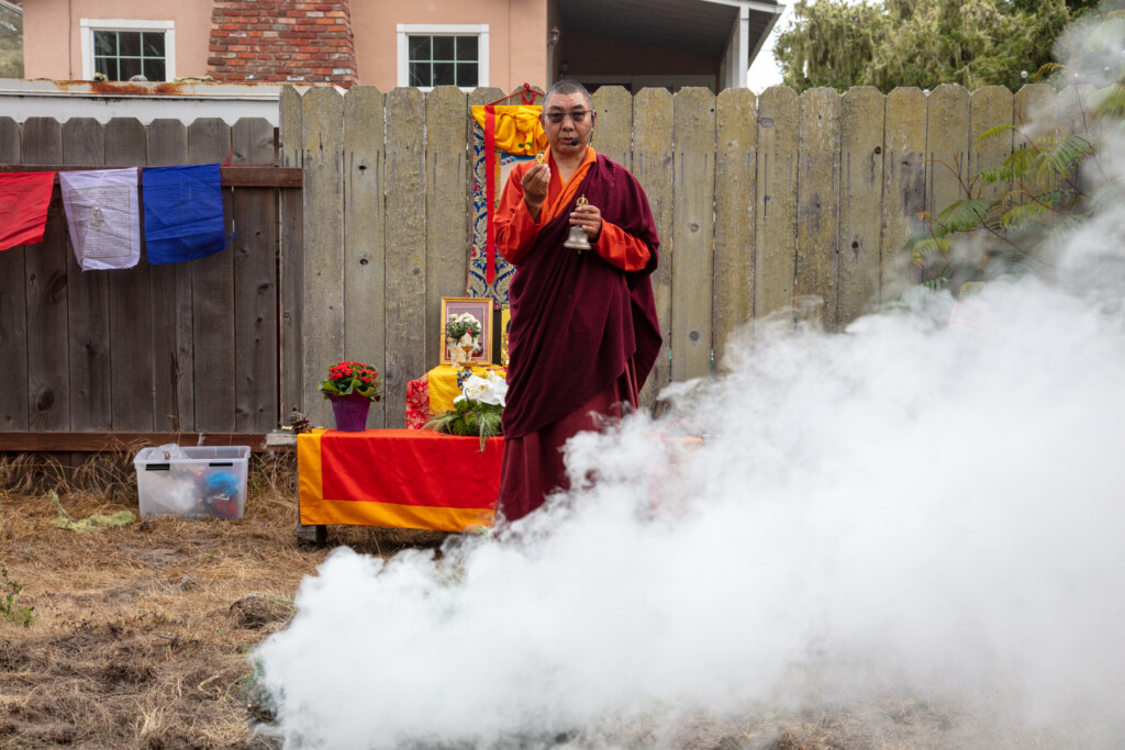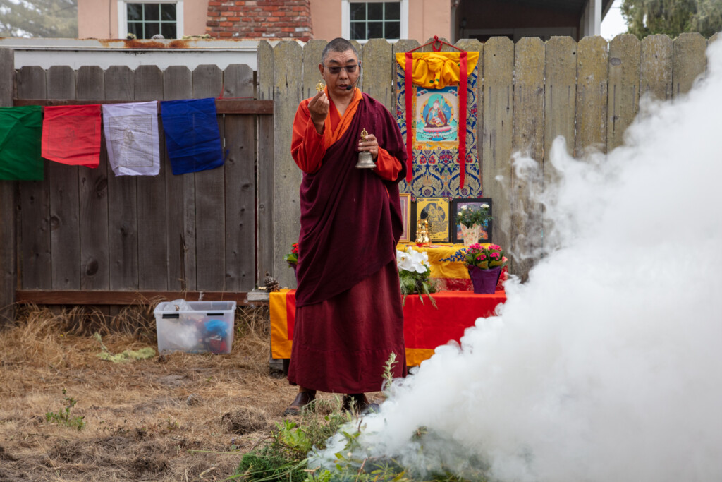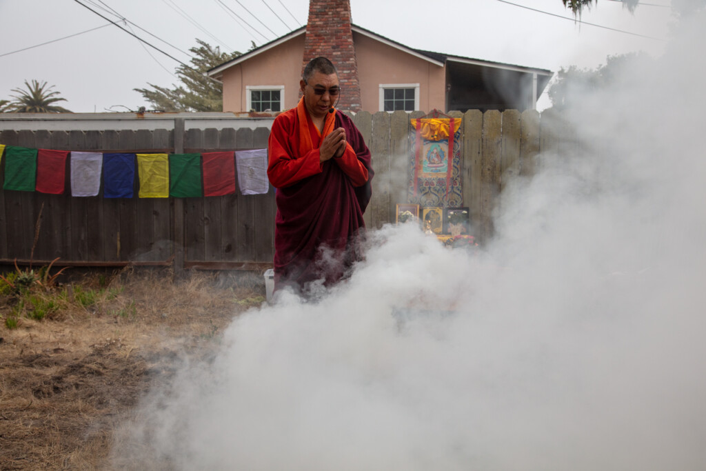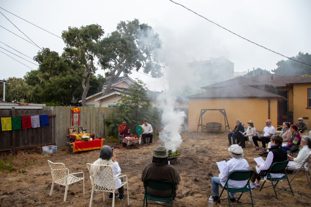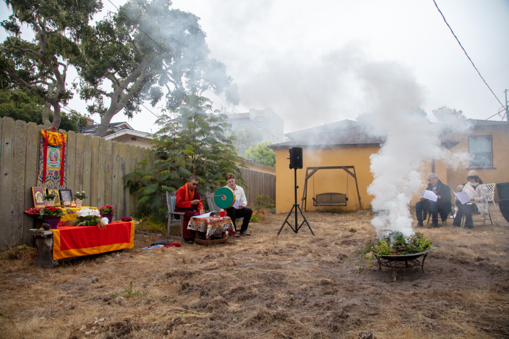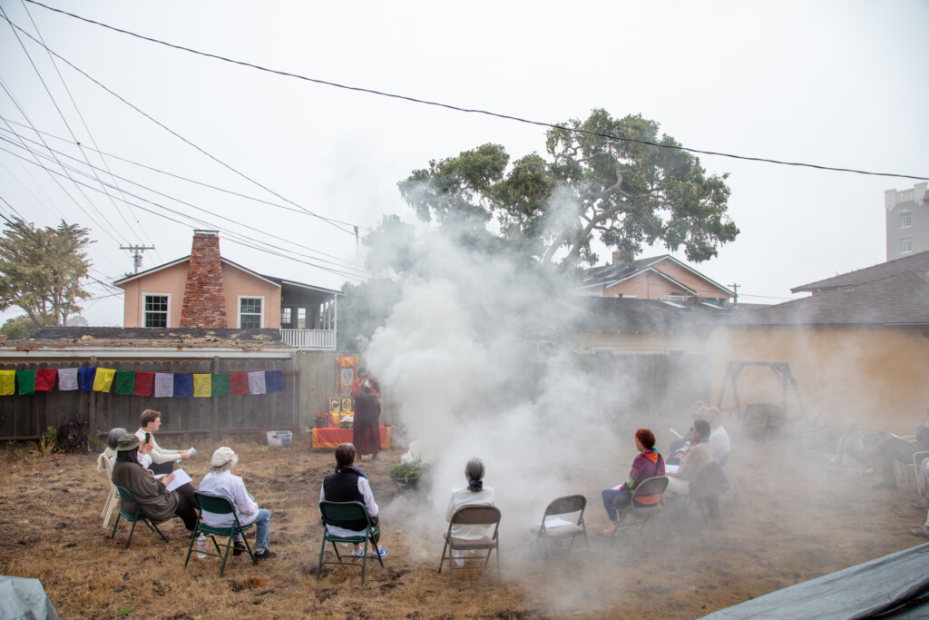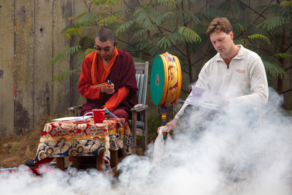 On Thursday, July 10, 2025 from 10:00am to 11:00am, Khenpo Karten Rinpoche conducted a ceremony for the occasion of Dzam Ling Chi Sang, known also as Universal Prayer day. The ceremony is for purification on the full moon day of the 5th Tibetan month, and involves special herbs and consecrated fire (more background is below). The smoke from this year’s fire was especially beautiful, and the feeling of blessing was palpable. Here are photos from the day taken by Miles McBreen/Karma Palden.